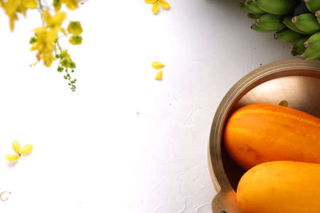 Golden shower flower,yellow cucumber and raw banana bunch arranged on a white surface with grey textured background and a brass traditional vessel or urule arranged in the background.