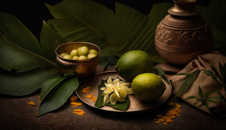 A traditional clay pot adorned with vibrant flowers and surrounded by mangoes, perfect for celebrating cultural festivals. The serene background creates a festive atmosphere.