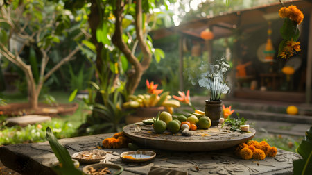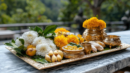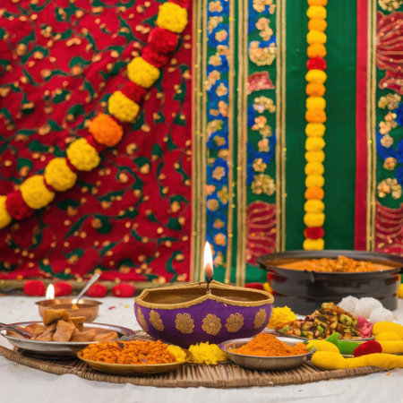 A visually rich scene captures the essence of an Indian festival with offerings laid out on a table. Central to the display are ornate diyas, lit to cast a warm glow, surrounded by colorful sweets and decorative elements. The background features festive fabric and marigold garlands, enhancing the celebratory and auspicious mood. This arrangement evokes joy and tradition.