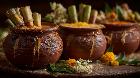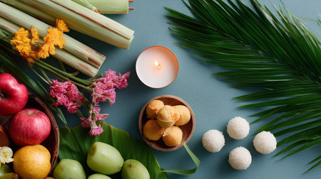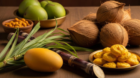 Sugarcane, fruits, flowers, pots outdoors, harvest festival setup