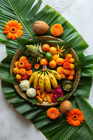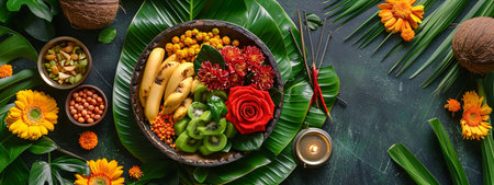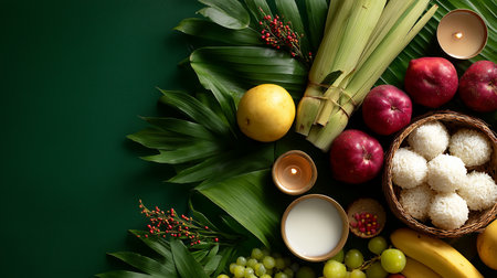 Fresh fruits and rice arranged with tropical leaves on a green background for a festive occasion