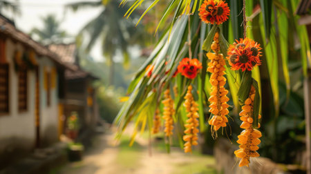 Traditional Sinhala and Tamil New Year decorations, such as handwoven palm leaf decorations (Kokis) hanging outdoors, with the backdrop of a village setting