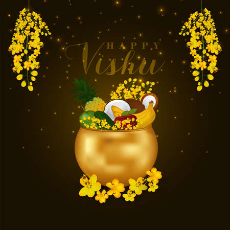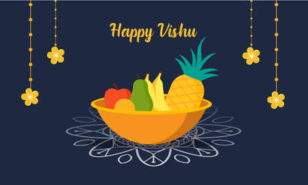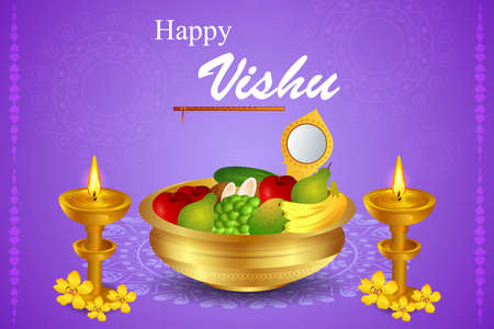 Happy Vishu greetings. April 14 Kerala festival with Vishu Kani, vishu flower Fruits and vegetables in a bronze vessel. vector illustration design