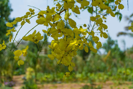 Golden shower tree cheerful blooming in natural park. Cassia fistula. Selective focus.