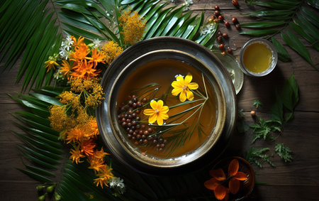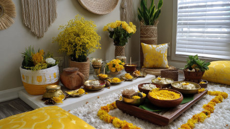 This vibrant image showcases hands delicately mixing yellow powder amidst a traditional festive setup. Fresh lemons and flowers enhance the atmosphere of creativity and celebration.
