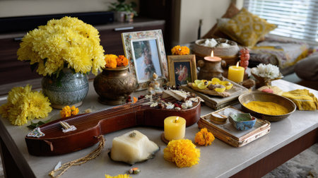 An artistic arrangement featuring a musical instrument amidst vibrant flowers and traditional offerings, creating a warm and inviting festive atmosphere.