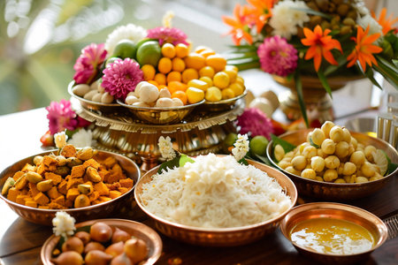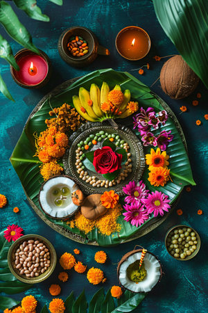 Assorted Indian food set with flowers and palm leaves. Dishes of Indian dishes for puja ceremony