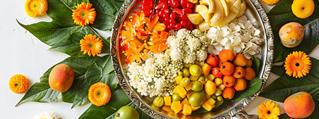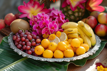 Fresh tropical fruits. Assorted exotic fruits and flowers for traditional puja ceremony to worship