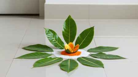 A serene indoor flower arrangement featuring a colorful bloom surrounded by green leaves and decorative elements, perfect for celebrating beauty and nature.