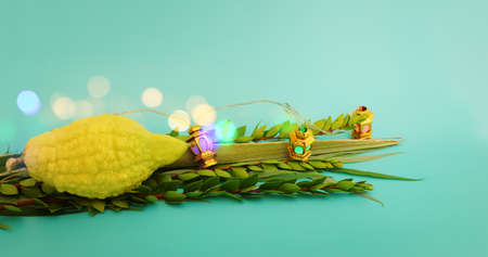 Jewish festival of Sukkot. Traditional symbols (The four species): Etrog (citron), lulav (palm branch), hadas (myrtle), arava (willow)