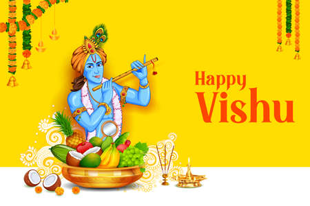 Happy Vishu Festival Vector Illustration with Krishna,Traditional Kerala Kani, Fruits and Vegetables in National Holiday Flat Cartoon Background