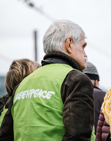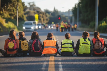 Climate change activists in high visibility vests sit on roadway to block traffic during protest