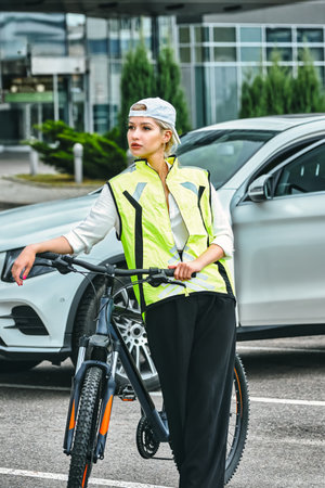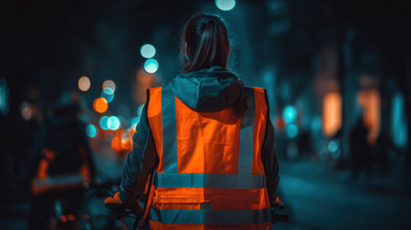 Cyclist wearing a bright reflective vest stands on a dimly lit street, gazing at the city lights while enjoying the lively urban atmosphere at night.