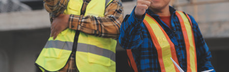 close up half body cropping image banner. Team engineer technician and foreman arms crossed work success, business corporate industry teamwork. technician successful concept.