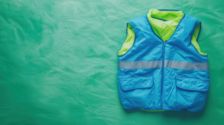 This image features a bright blue safety vest laid out on a green background, perfect for work environments, outdoor activities, and emergency situations.