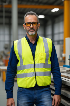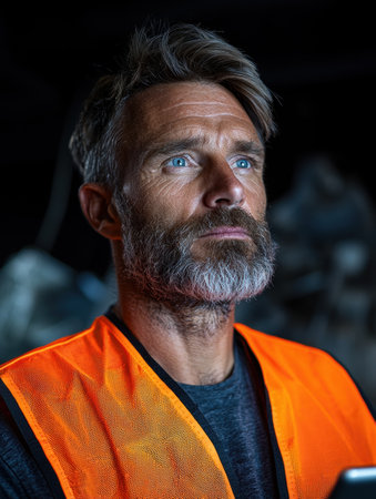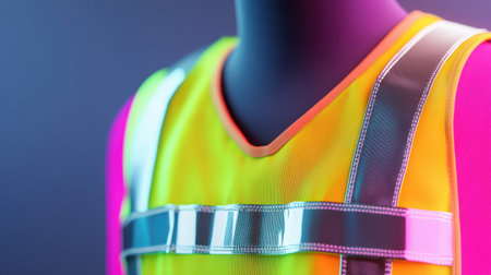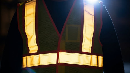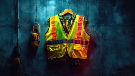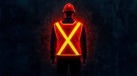 Construction vest with glowing reflective lines against dark industrial backdrop
