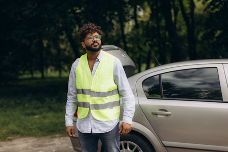 Young man in high-visibility vest stands beside broken-down car on roadside, waiting for roadside assistance and help