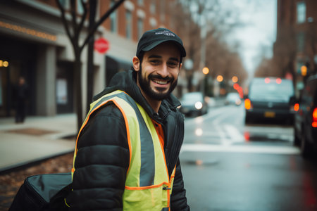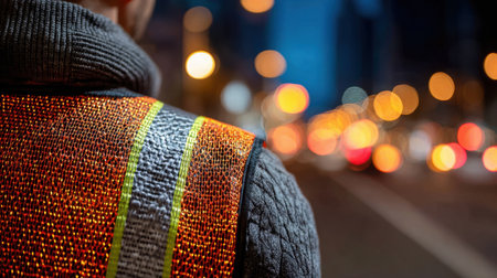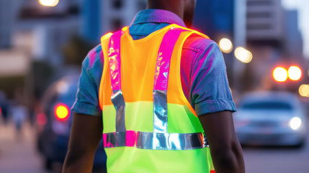 This captivating urban scene captures a worker in a reflective safety vest against a backdrop of illuminated traffic lights, creating a striking juxtaposition of safety and city life.