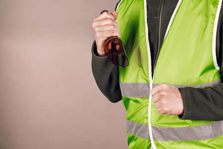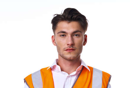 Job and work concept. Part body man worker wearing orange uniform safrty vest. Repairman inspector isolated on white.