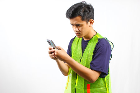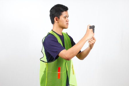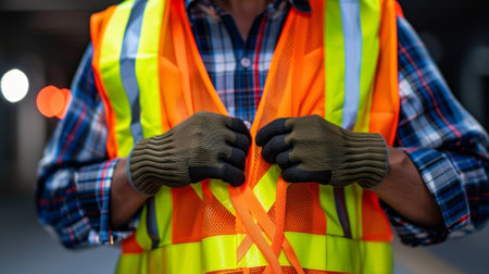 A construction employee puts on a reflective safety vest before entering the site ensuring visibility and safety