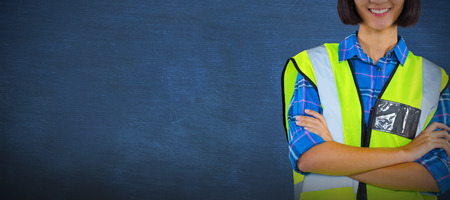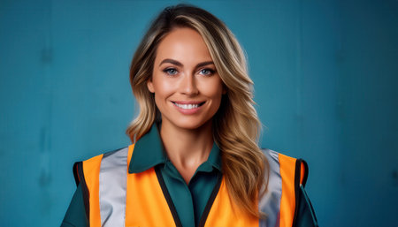 Smiling woman in a safety vest encourages waste sorting and conservation efforts for Earth Day
