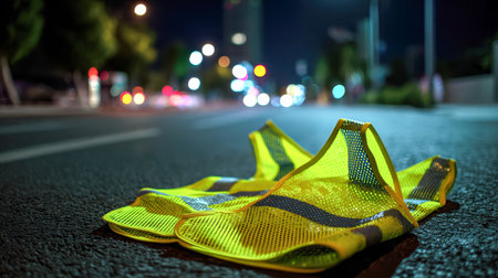 Captivating image of a bright reflective safety vest resting on a dark road surface, surrounded by sparkling lights that enhance its visibility and appeal.