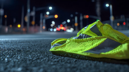 A vivid yellow safety vest rests forgotten on a shadowed city street, illuminated by distant glowing lights that blur into a tapestry of nocturnal urban energy.
