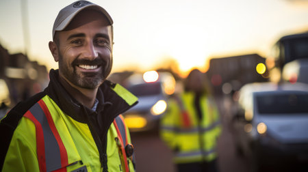 A construction worker is seen on a bustling urban street wearing a bright safety vest as dusk falls. He directs traffic while maintaining safety during evening work hours.