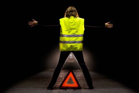 A girl wearing a fluo safety jacket trying to stop a on a road at night.