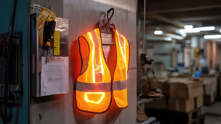 A bright orange reflective safety vest hangs on a wall in an industrial space, highlighting crucial safety measures for workers and emphasizing visibility in busy environments.