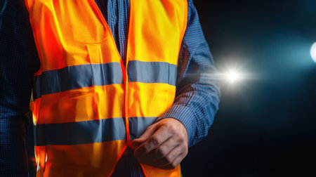 A high-visibility orange safety vest featuring reflective stripes is showcased under dramatic lighting, emphasizing its importance in safety and protection.