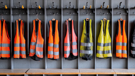 A collection of brightly colored safety vests displayed neatly on hooks in a modern industrial setting, emphasizing safety culture, organization, and workplace efficiency.