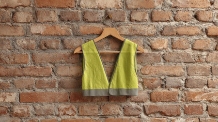 A bright yellow safety vest displayed on a wooden hanger against a rustic brick wall, emphasizing safety and construction themes in a minimalist setting.