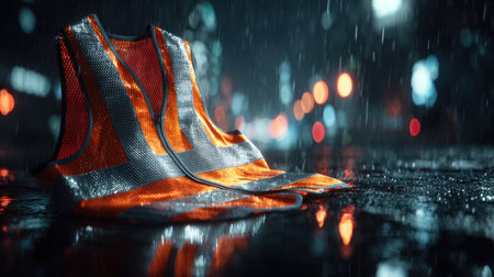 A vivid safety vest rests on a wet pavement, illuminated by city lights during a nighttime rain, emphasizing the importance of visibility in urban environments.