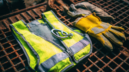 A vibrant safety vest and a pair of work gloves are laid out on a metal grate, accompanied by a carabiner hook, emphasizing essential gear for safe work practices.