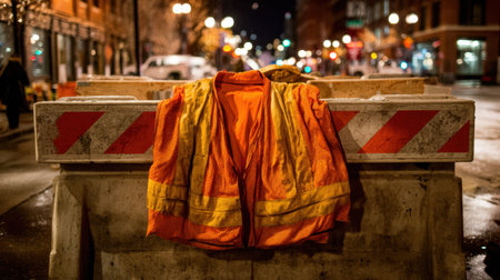 A bright orange safety jacket drapes over a construction barrier on an urban street at night. The vibrant colors and city lights create a striking, cautionary scene.