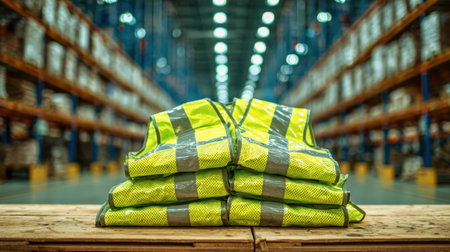 A stack of bright yellow safety vests is displayed on a wooden table, set against the backdrop of a well-organized warehouse, emphasizing workplace safety and efficiency.
