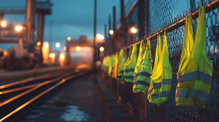 A serene dusk scene featuring high-visibility safety vests hung on a fence near industrial rails. The warm ambient lighting creates a dramatic urban atmosphere.