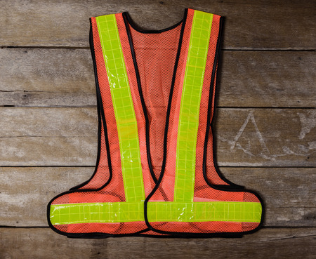 Reflective vest lie on a black wooden board as a background, special clothing, flat lay