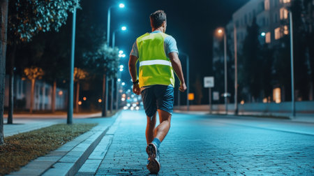 A person wearing a reflective vest while jogging at night, ensuring visibility and safety