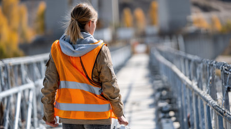 A woman wearing an orange vest walks across a bridge. The scene is calm and peaceful, with the woman looking ahead and the bridge stretching out into the distance
