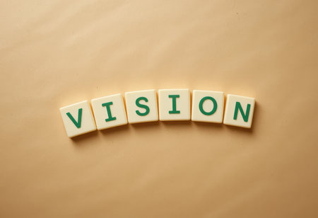 A creative arrangement of letter tiles spelling 'VISION' on a soft surface, illustrating clarity and insight. Ideal for concepts related to ambition and growth.