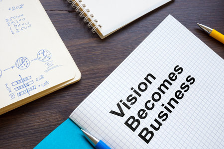 Concept of vision becomes business write on sticky notes isolated on Wooden Table. For entrepreneurship and goal achievement