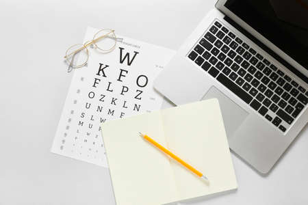 Bucharest, Romania - June 18,2016 : Trial frames used in vision eyesight checkup, eye chart on the background