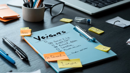 A close-up of a vision statement written on a notepad, surrounded by sticky notes and pens