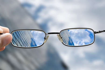 out of focus glass business building with sky and clouds above and hand holding glasses that correct the vision