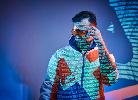 Cool and confident caucasian adult man wearing stylish sunglasses and racing blazer, posing in vivid neon studio lights of text projection, cyberpunk concept