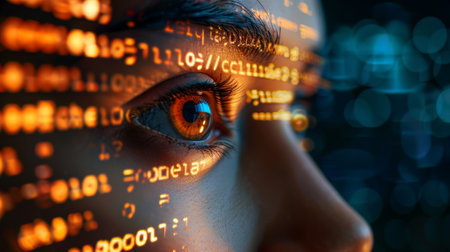 Close-up of a human eye with binary code. Technology concept
