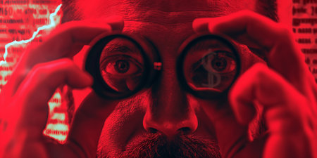 Man with Binoculars in Red Light Reading Stimulated by Data and Information.