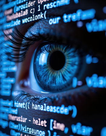 Close up of a programmer's eye with computer code reflecting in it, showcasing the fusion of technology and human vision